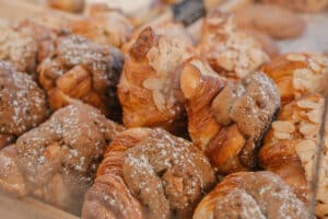 Plain Croissant | Pain au Chocolat | Almond Croissant | Cinnamon Sugar Cruffin | Strawberry Danish | Cheese Danish | Lemon Danish | Cardamom Pistachio Morning Bun | Cinnamon Roll | Strawberry Roll | Cranberry Orange Scone | Chocolate Oat Cookie | Spinach and Feta Danish | Ham & Cheese Croissant